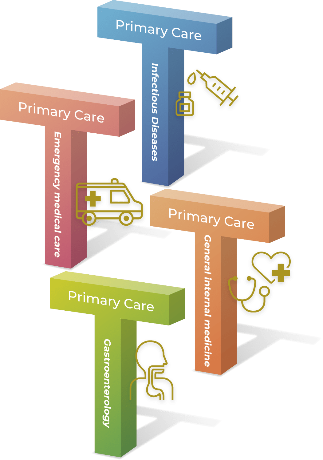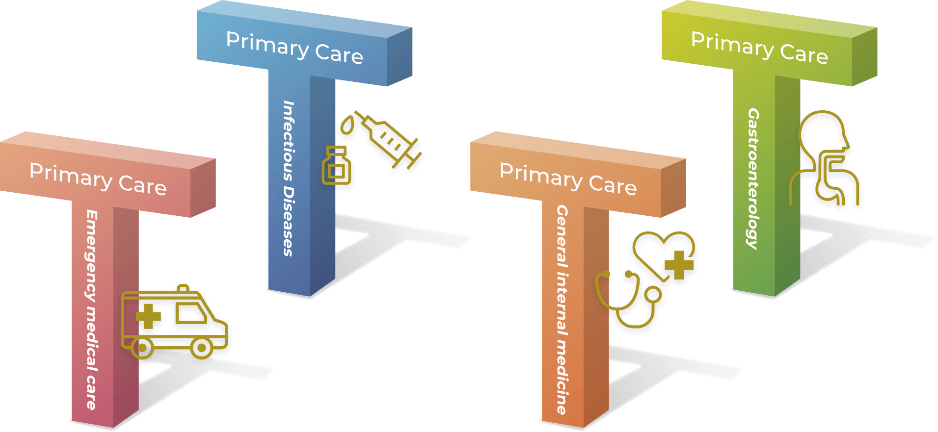 (1) Emergency medical care, (2) Infectious diseases, (3) General internal medicine, (4) Gastroenterology.